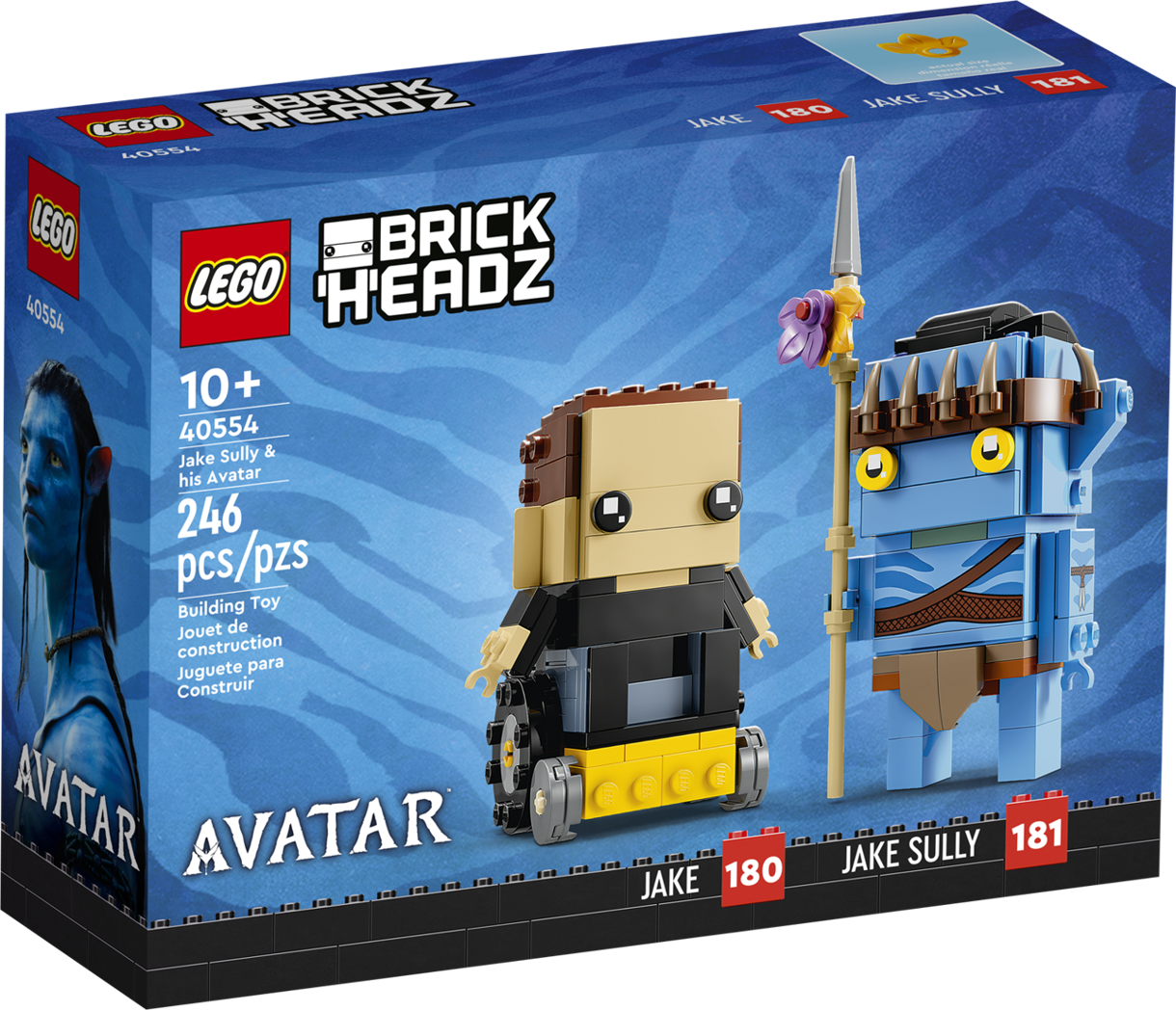Les deux modèles peuvent être exposés ensemble ou séparément, permettant de mettre en valeur l’évolution du personnage de Jake Sully entre sa forme humaine et son incarnation Na’vi. Ce set est également parfait pour compléter une collection LEGO® BrickHeadz dédiée aux licences cinéma et science-fiction.