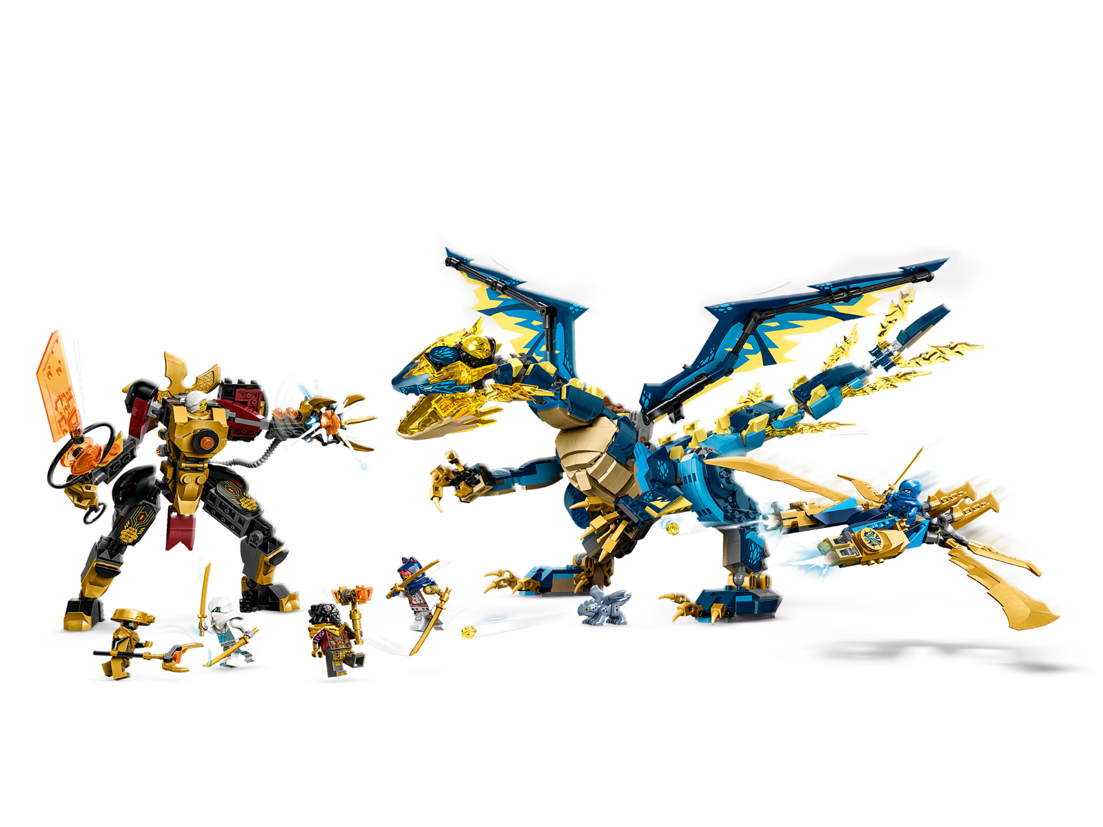 Les fans de ninjas dès 9 ans peuvent rejouer un combat épique de la série télévisée NINJAGO® : L’ascension des dragons avec Le dragon élémentaire contre le robot de l’impératrice (71796). Jiro, le redoutable dragon, peut être équipé avec les ailes en lames dorées et les fusils du planeur pour affronter le robot doré articulé de l’impératrice et son puissant MegaQuake. Le set inclut 6 minifigurines : Jay, Sora et Zane armés de 2 katanas chacun, Lord Ras armé d’un marteau, l’impératrice Béatrix avec son sabre d’Impérium et un garde d'Impérium avec un bâton, qui s’affrontent pour l’élément de pouvoir du dragon jaune. 4 autres éléments de différentes couleurs ainsi que 4 noyaux d’énergie du dragon d’or sont à collectionner dans d’autres sets NINJAGO.