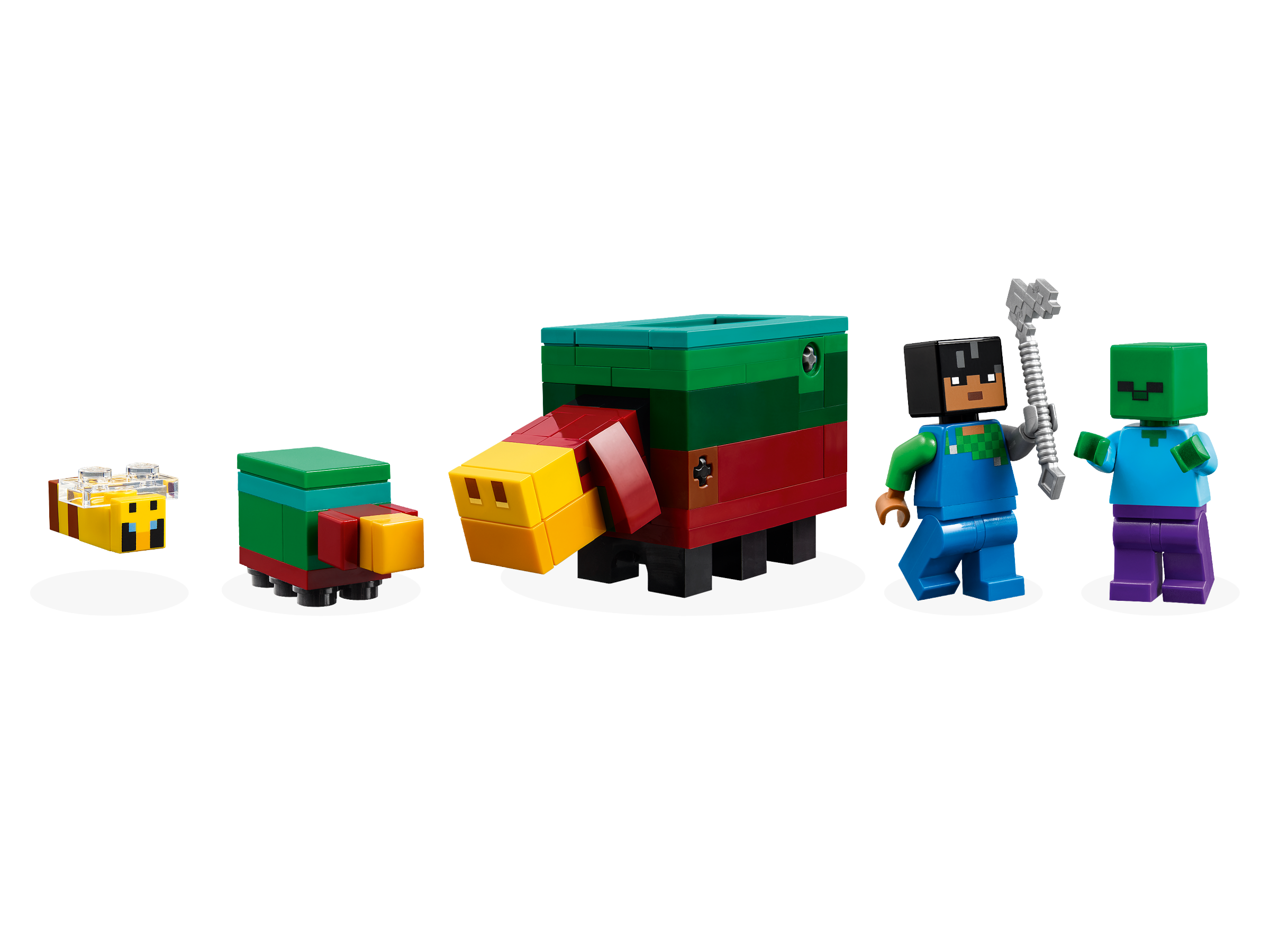 Le set inclut plusieurs personnages et créatures emblématiques de Minecraft®, dont Sunny, la première figurine LEGO® Minecraft® issue du biome des cerisiers en fleurs, ainsi que des abeilles, un renifleur adulte, un reniflet (baby sniffer), un œuf de renifleur et même un zombie, pour enrichir les scénarios de jeu et d’exploration.
