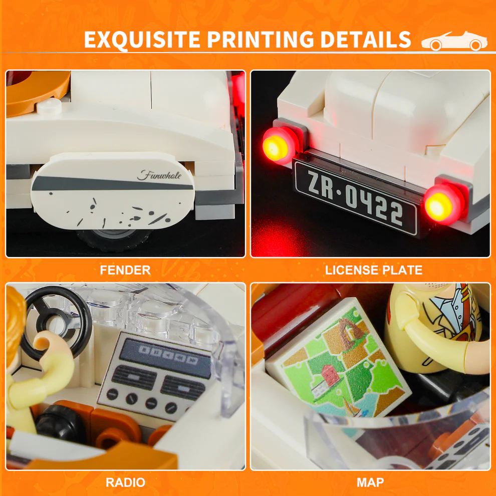 Le système d’éclairage intégré est l’un des points forts du set. Les phares avant fonctionnels et les feux arrière rouges donnent vie à la voiture et transforment complètement le diorama une fois la lumière allumée.