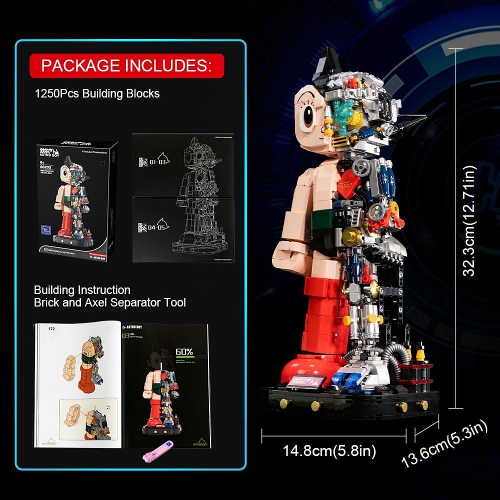 Plonge dans l’univers rétro-technique avec Astro Boy Mechanical : un set de construction créatif et semi-mécanique qui met en valeur le design iconique d’Astro Boy avec une structure intérieure visible. Avec des pièces de haute qualité, ce modèle à assembler devient une figurine exposable de près de 32 cm, parfaite pour les fans d’anime, de robotique et de décorations geek.